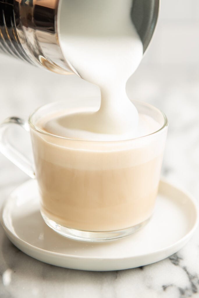 5. Combine your ingredients: Pour most of the milk into your mug with the tea concentrate. Stir in the remaining ingredients and add any cream or vanilla to your latte. Then, add in the last of the milk and foam.