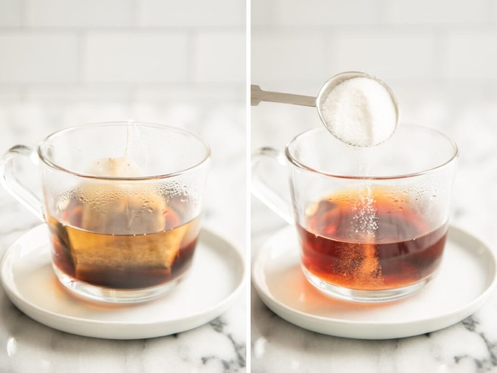 - In a small pot, kettle, or your microwave, bring water to a boil. Pour ½ cup of water into an 8-ounce mug and steep tea bags for 5 minutes. Remove and discard tea bags. Stir in the sugar.